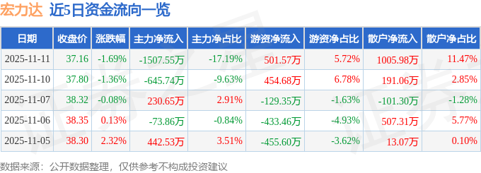 11月11日的资金流向数据方面,主力资金净流出1507.55万元,占总成交额17.19%,游资资金净流入501.57万元,占总成交额5.72%,散户资金净流入1005.98万元,占总成交额11.47%。