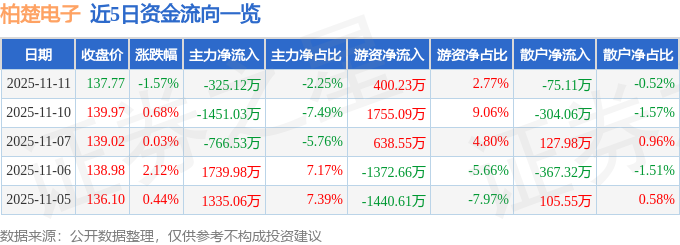 证券之星消息,截至2025年11月11日收盘,柏楚电子(688188)报收于137.77元,下跌1.57%,换手率0.36%,成交量1.04万手,成交额1.45亿元。