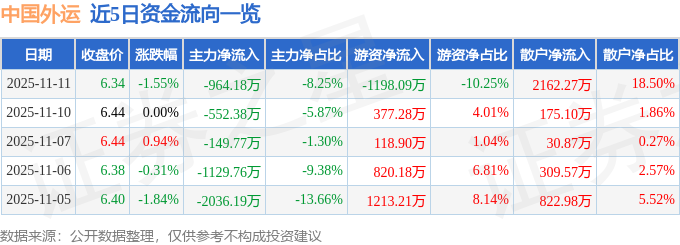 证券之星消息,截至2025年11月11日收盘,中国外运(601598)报收于6.34元,下跌1.55%,换手率0.35%,成交量18.34万手,成交额1.17亿元。