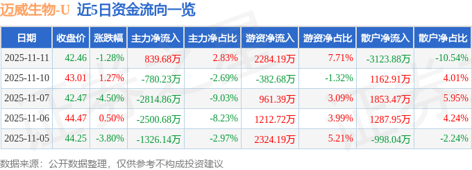 证券之星消息,截至2025年11月11日收盘,迈威生物(688062)报收于42.46元,下跌1.28%,换手率3.34%,成交量6.82万手,成交额2.96亿元。
