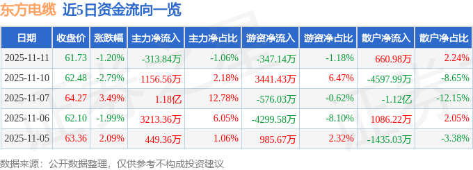 证券之星消息,截至2025年11月11日收盘,东方电缆(603606)报收于61.73元,下跌1.2%,换手率0.69%,成交量4.75万手,成交额2.95亿元。