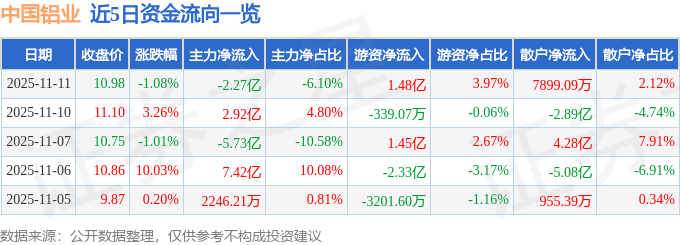 证券之星消息,截至2025年11月11日收盘,中国铝业(601600)报收于10.98元,下跌1.08%,换手率2.57%,成交量338.14万手,成交额37.21亿元。