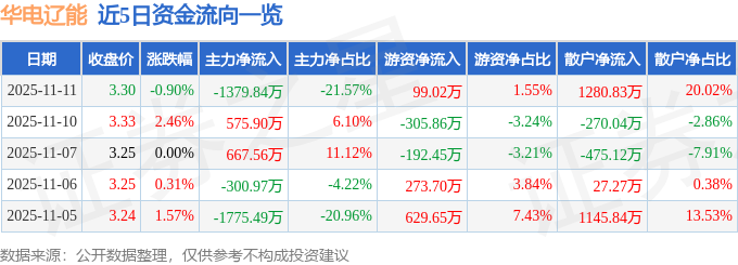 证券之星消息,截至2025年11月11日收盘,华电辽能(600396)报收于3.3元,下跌0.9%,换手率1.31%,成交量19.35万手,成交额6396.95万元。