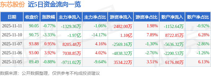证券之星消息,截至2025年11月11日收盘,东芯股份(688110)报收于90.05元,下跌0.77%,换手率3.1%,成交量13.72万手,成交额12.55亿元。