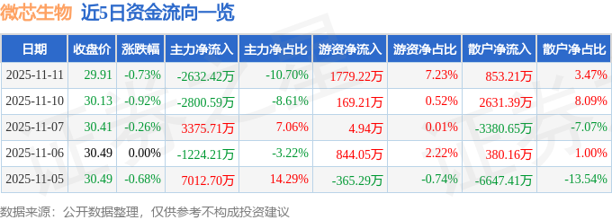 证券之星消息,截至2025年11月11日收盘,微芯生物(688321)报收于29.91元,下跌0.73%,换手率2.02%,成交量8.24万手,成交额2.46亿元。