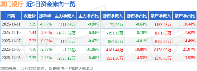 证券之星消息,截至2025年11月11日收盘,厦门银行(601187)报收于7.39元,下跌0.67%,换手率0.58%,成交量15.33万手,成交额1.13亿元。