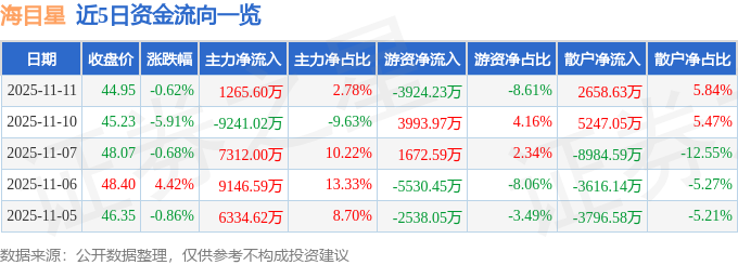 11月11日的资金流向数据方面,主力资金净流入1265.6万元,占总成交额2.78%,游资资金净流出3924.23万元,占总成交额8.61%,散户资金净流入2658.63万元,占总成交额5.84%。