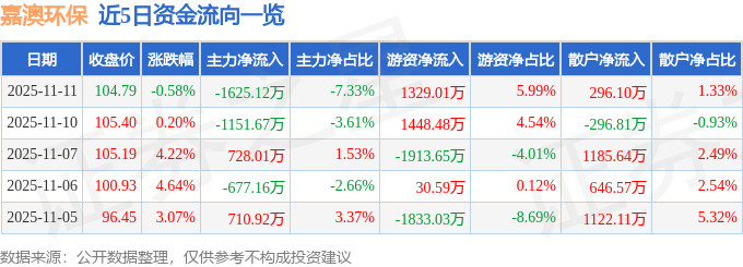 11月11日的资金流向数据方面,主力资金净流出1625.12万元,占总成交额7.33%,游资资金净流入1329.01万元,占总成交额5.99%,散户资金净流入296.1万元,占总成交额1.33%。