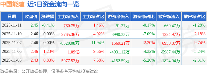 证券之星消息,截至2025年11月11日收盘,中国能建(601868)报收于2.45元,下跌0.41%,换手率0.65%,成交量212.12万手,成交额5.22亿元。