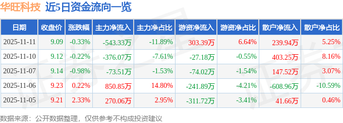 证券之星消息,截至2025年11月11日收盘,华旺科技(605377)报收于9.09元,下跌0.33%,换手率0.9%,成交量5.02万手,成交额4569.68万元。