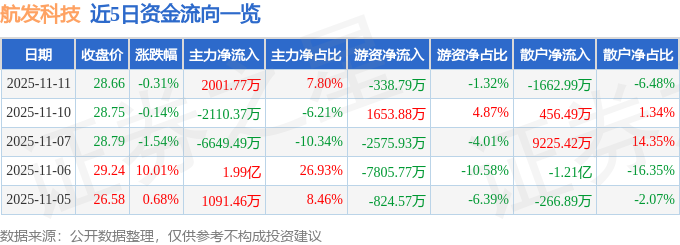 证券之星消息,截至2025年11月11日收盘,航发科技(600391)报收于28.66元,下跌0.31%,换手率2.71%,成交量8.96万手,成交额2.57亿元。