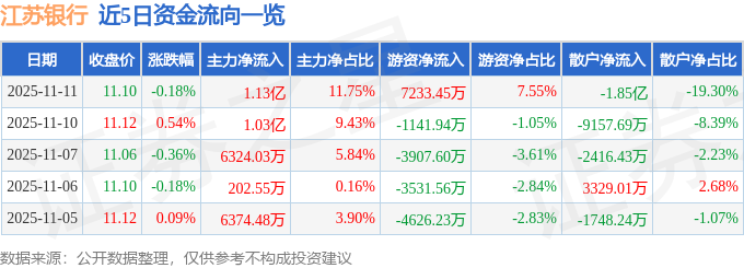 证券之星消息,截至2025年11月11日收盘,江苏银行(600919)报收于11.1元,下跌0.18%,换手率0.47%,成交量86.34万手,成交额9.59亿元。