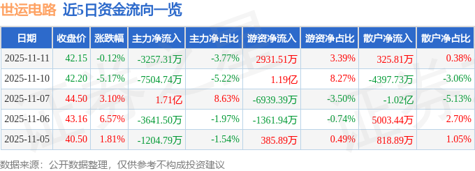 证券之星消息,截至2025年11月11日收盘,世运电路(603920)报收于42.15元,下跌0.12%,换手率2.83%,成交量20.39万手,成交额8.64亿元。