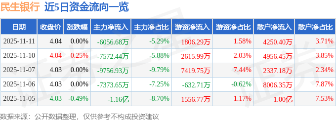 证券之星消息,截至2025年11月11日收盘,民生银行(600016)报收于4.04元,上涨0.0%,换手率0.8%,成交量282.73万手,成交额11.44亿元。