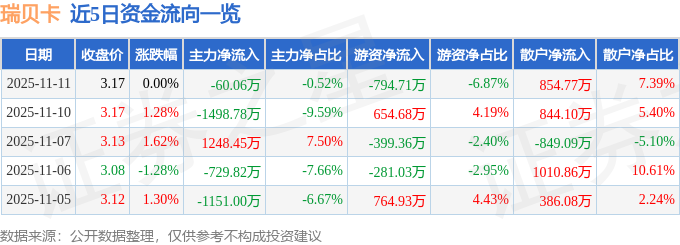 证券之星消息,截至2025年11月11日收盘,瑞贝卡(600439)报收于3.17元,上涨0.0%,换手率3.21%,成交量36.38万手,成交额1.16亿元。