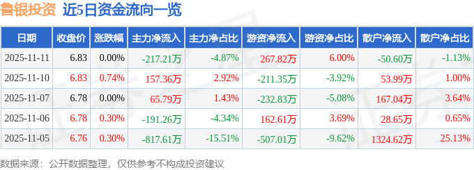 证券之星消息,截至2025年11月11日收盘,鲁银投资(600784)报收于6.83元,上涨0.0%,换手率0.97%,成交量6.54万手,成交额4460.53万元。