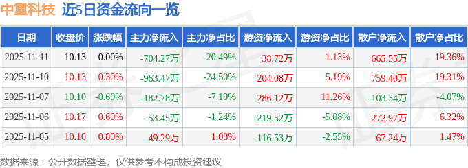 证券之星消息,截至2025年11月11日收盘,中重科技(603135)报收于10.13元,上涨0.0%,换手率1.34%,成交量3.38万手,成交额3437.48万元。