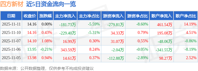 证券之星消息,截至2025年11月11日收盘,四方新材(605122)报收于14.16元,上涨0.0%,换手率1.33%,成交量2.3万手,成交额3251.96万元。