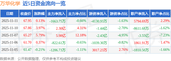 证券之星消息,截至2025年11月11日收盘,万华化学(600309)报收于67.95元,上涨0.13%,换手率1.19%,成交量37.35万手,成交额25.32亿元。