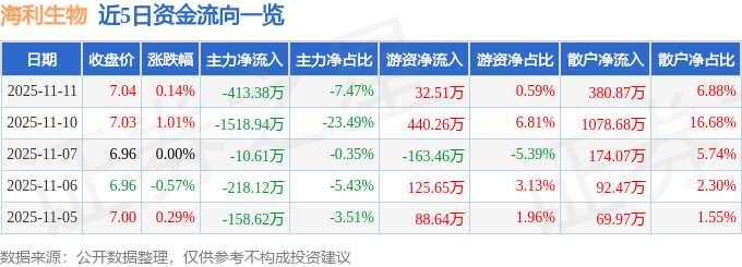 证券之星消息,截至2025年11月11日收盘,海利生物(603718)报收于7.04元,上涨0.14%,换手率1.21%,成交量7.87万手,成交额5535.67万元。