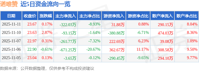 11月11日的资金流向数据方面,主力资金净流出322.03万元,占总成交额8.93%,游资资金净流入31.88万元,占总成交额0.88%,散户资金净流入290.15万元,占总成交额8.04%。