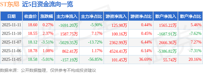 证券之星消息,截至2025年11月11日收盘,ST东尼(603595)报收于18.6元,上涨0.27%,换手率6.55%,成交量15.23万手,成交额2.87亿元。