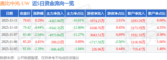 证券之星消息,截至2025年11月11日收盘,奥比中光(688322)报收于79.65元,上涨0.29%,换手率1.77%,成交量5.16万手,成交额4.12亿元。