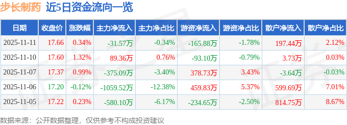 证券之星消息,截至2025年11月11日收盘,步长制药(603858)报收于17.66元,上涨0.34%,换手率0.5%,成交量5.29万手,成交额9300.19万元。