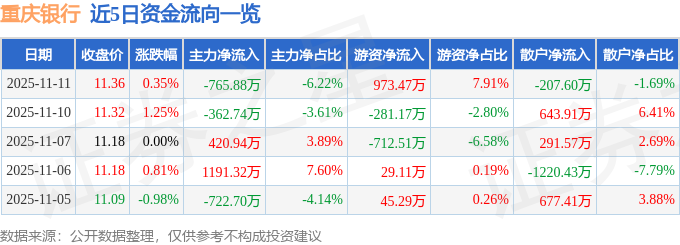 证券之星消息,截至2025年11月11日收盘,重庆银行(601963)报收于11.36元,上涨0.35%,换手率0.57%,成交量10.79万手,成交额1.23亿元。