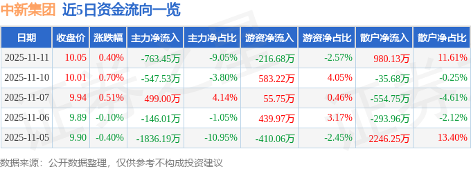 证券之星消息,截至2025年11月11日收盘,中新集团(601512)报收于10.05元,上涨0.4%,换手率0.56%,成交量8.43万手,成交额8439.48万元。