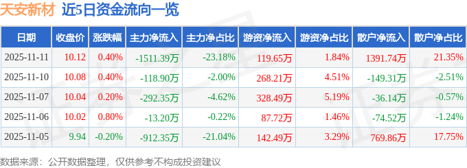 证券之星消息,截至2025年11月11日收盘,天安新材(603725)报收于10.12元,上涨0.4%,换手率2.25%,成交量6.44万手,成交额6519.8万元。
