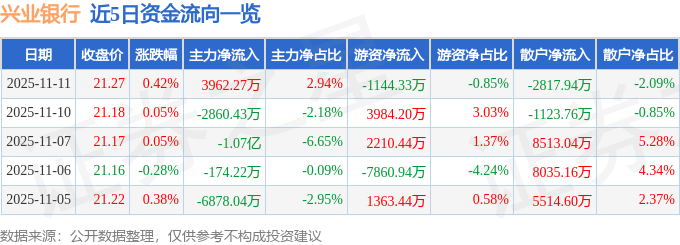 证券之星消息,截至2025年11月11日收盘,兴业银行(601166)报收于21.27元,上涨0.42%,换手率0.3%,成交量63.48万手,成交额13.49亿元。