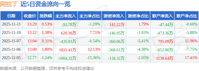 证券之星消息,截至2025年11月11日收盘,阿拉丁(688179)报收于13.29元,上涨0.53%,换手率1.79%,成交量5.94万手,成交额7892.21万元。