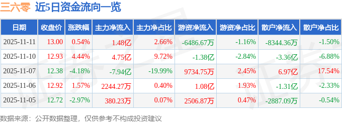 证券之星消息,截至2025年11月11日收盘,三六零(601360)报收于13.0元,上涨0.54%,换手率6.03%,成交量422.39万手,成交额55.69亿元。