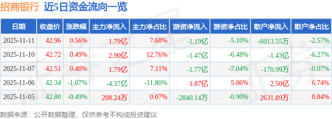 证券之星消息,截至2025年11月11日收盘,招商银行(600036)报收于42.96元,上涨0.56%,换手率0.26%,成交量54.47万手,成交额23.36亿元。