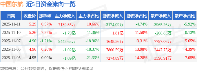 证券之星消息,截至2025年11月11日收盘,中国东航(600115)报收于5.29元,上涨0.57%,换手率0.75%,成交量127.21万手,成交额6.7亿元。
