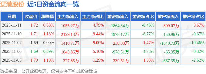 证券之星消息,截至2025年11月11日收盘,辽港股份(601880)报收于1.72元,上涨0.58%,换手率0.7%,成交量128.56万手,成交额2.2亿元。