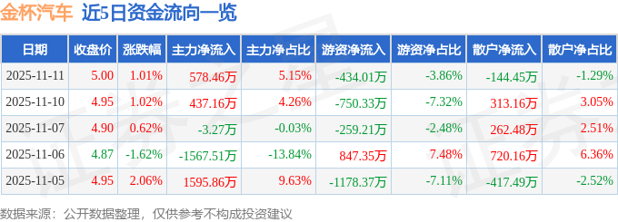 11月11日的资金流向数据方面,主力资金净流入578.46万元,占总成交额5.15%,游资资金净流出434.01万元,占总成交额3.86%,散户资金净流出144.45万元,占总成交额1.29%。