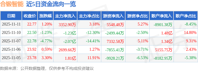 证券之星消息,截至2025年11月11日收盘,合锻智能(603011)报收于22.77元,上涨1.2%,换手率9.39%,成交量46.44万手,成交额10.53亿元。