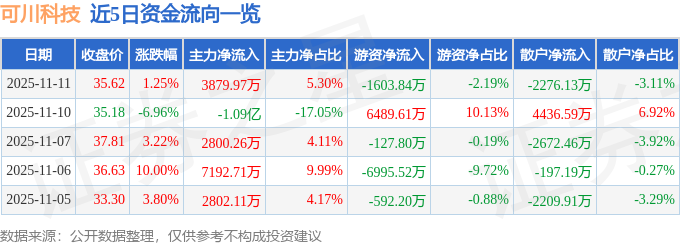 证券之星消息,截至2025年11月11日收盘,可川科技(603052)报收于35.62元,上涨1.25%,换手率10.52%,成交量19.77万手,成交额7.32亿元。
