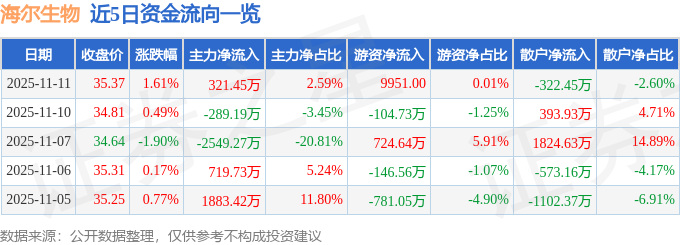 证券之星消息,截至2025年11月11日收盘,海尔生物(688139)报收于35.37元,上涨1.61%,换手率1.11%,成交量3.54万手,成交额1.24亿元。