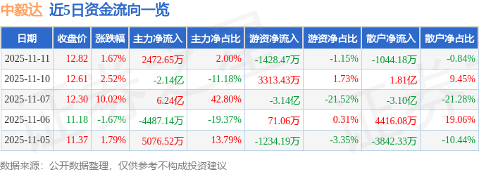 证券之星消息,截至2025年11月11日收盘,中毅达(600610)报收于12.82元,上涨1.67%,换手率13.78%,成交量97.63万手,成交额12.39亿元。