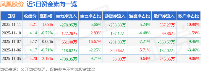 证券之星消息,截至2025年11月11日收盘,凤凰股份(600716)报收于4.21元,上涨1.69%,换手率1.26%,成交量11.77万手,成交额4928.36万元。