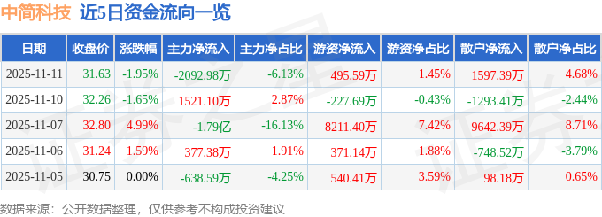 证券之星消息,截至2025年11月11日收盘,中简科技(300777)报收于31.63元,下跌1.95%,换手率2.53%,成交量10.71万手,成交额3.41亿元。