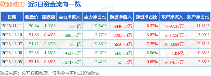 证券之星消息,截至2025年11月11日收盘,软通动力(301236)报收于50.34元,下跌1.93%,换手率1.64%,成交量12.87万手,成交额6.54亿元。
