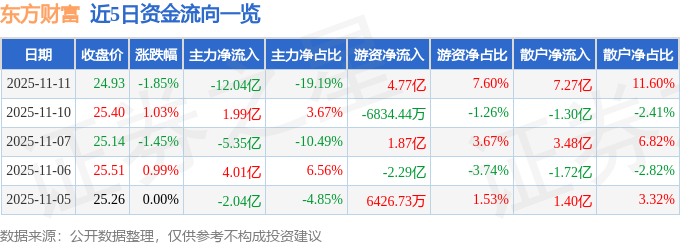 证券之星消息,截至2025年11月11日收盘,东方财富(300059)报收于24.93元,下跌1.85%,换手率1.87%,成交量249.96万手,成交额62.72亿元。