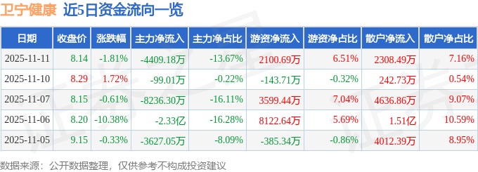 证券之星消息,截至2025年11月11日收盘,卫宁健康(300253)报收于8.14元,下跌1.81%,换手率2.06%,成交量39.47万手,成交额3.23亿元。
