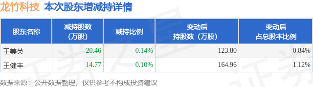 证券之星消息,11月11日龙竹科技发布公告《龙竹科技:股东减持股份结果公告》,其股东王健丰、王美英于2025年11月5日至2025年11月7日间合计减持35.23万股,占公司目前总股本的0.2397%,变动期间该股股价下跌7.93%,截止11月7日收盘报12.31元。