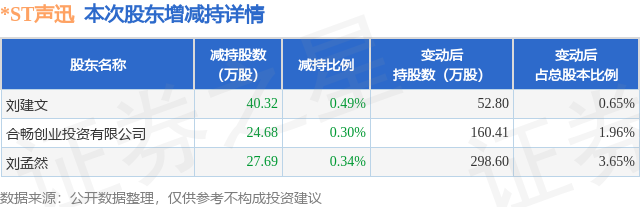 证券之星消息,11月11日*ST声迅发布公告《*ST声迅:关于特定股东减持计划期限届满的公告》,其股东刘建文、合畅创业投资有限公司、刘孟然于2025年8月11日至2025年11月10日间合计减持92.69万股,占公司目前总股本的1.1323%,变动期间该股股价上涨16.18%,截止11月10日收盘报21.47元。