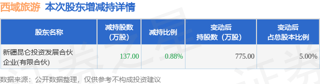 证券之星消息,11月11日西域旅游发布公告《西域旅游:简式权益变动报告书》,其股东新疆昆仑投资发展合伙企业(有限合伙)于2025年11月10日合计减持137.0万股,占公司目前总股本的0.8839%,变动期间该股股价上涨1.73%,截止11月10日收盘报39.38元。